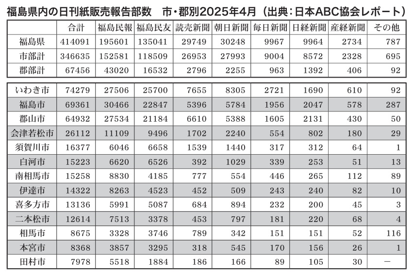 日本ABC協会は新聞・雑誌社、広告主、広告会社からなる団体で、半年ごとに部数を調査し発表している。3月号記事では、新型コロナ禍を経て、24万部だった福島民報は4万部(約17%)減り、17万部だった福島民友は3万部(約20%)減らしていたことを報じた。全国紙は5000~1万部減少し、割合では各紙約30%の減少だった。