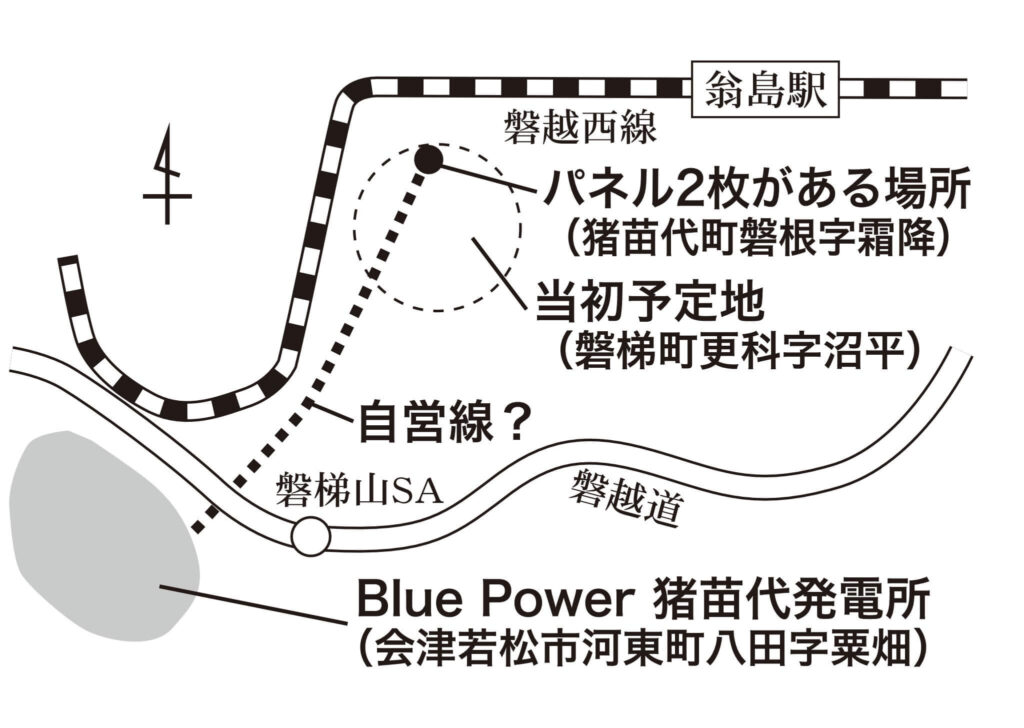 (中略)2枚のパネルが置かれた土地は合同会社いわき綜合開発(東京都八王子市)の所有地と猪苗代町が管理する公道に囲まれているため、ここから飛び地に自営線を向かわせるには、どちらかの土地を「通らせてもらう」必要がある。だが、いわき綜合開発に聞くと「自営線を通させてほしいという話はきていない」と言い、猪苗代町建設課も「公道を通すなら許可が必要だが、申請はされていない」と話す》