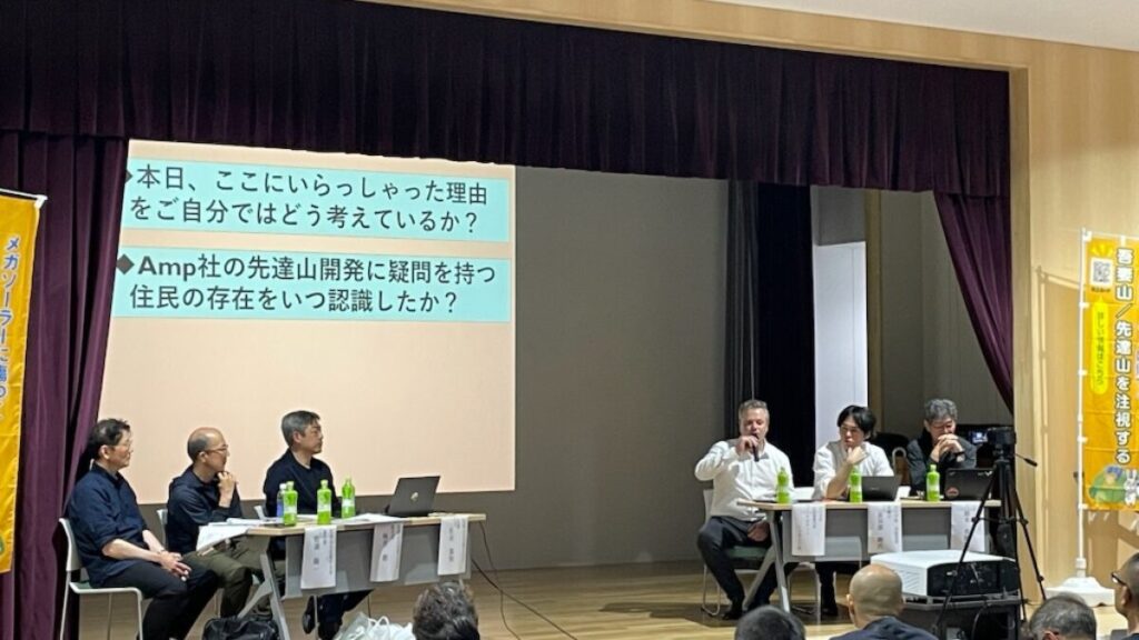 福島市西部の先達山で進むメガソーラー工事の問題点を追及している市民団体「先達山を注視する会」(松谷基和代表。以下、先注会と略)の対話会が5月10日、福島市で開かれた。今回で3回目となる対話会には開発事業者であるカナダの再エネ投資・運営会社Amp Energy(以下Amp社と略)の日本法人代表を務めるマルティン・シュタイン氏が出席することもあり、会場の市民センター大ホールには大勢の市民やマスコミが詰めかけた。